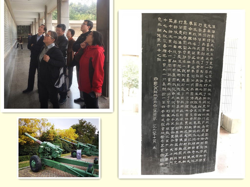 徐州因其重要的地理位置,自古都是兵家必争之地,解放战争时期“三大战役”中最为关键的淮海战役就发生在徐州。20日一到徐州,我们便首先瞻仰了淮海战役纪念塔。纪念塔坐落于徐州市南郊的凤凰山东麓,于1959年4月经中国国务院批准兴建,1965年落成。塔高38.15米。塔体正面是毛泽东主席题写的塔名。塔座正面镌刻着碑文,两侧为大型浮雕。在淮海战役纪念塔周围一圈走廊的墙壁上,镌刻着几处领导人的题词和碑文,最主要的还是密密麻麻地镌刻了无数战斗中牺牲的烈士的姓名。环绕一周,我们感慨万千,在七十年前那场双方兵力合计超过两百万的惊天大战中,正是无数的烈士抛头颅洒热血,才争取到最终胜利,为全中国的解放奠定了基础,我们现在的美好生活,也正是因为无数象他们一样献出宝贵生命的烈士,才得以实现。接下来,我们继续参观了淮海战役纪念馆,随着馆内讲解员一起重温了这次战役的始末,缅怀了在这次战役中牺牲的革命先烈们。在参观过程中,徐萍教授回忆起,她的父亲曾经随野战军21军参加了这场战役,在徐萍教授的讲述中,大家对当年先辈“不怕牺牲,奋勇向前”的革命精神有了更深的体会。