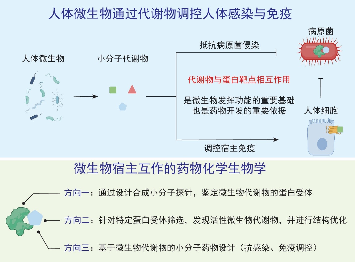 人体携带着大量的微生物,这些微生物栖息在人体的口腔、肠道、皮肤等不同部位,在人体健康维持和疾病的发生、发展中发挥着重要的作用。人体微生物可以代谢合成一系列结构特异的活性分子,比如胆汁酸代谢物、氨基酸代谢物以及维生素代谢物等。这些活性分子与其靶点蛋白的相互作用是人体微生物发挥功能的重要基础,也是基于人体微生物进行药物开发的重要依据。然而,人们对于人体微生物代谢物的研究尚处于起步阶段:1)很多已知微生物代谢物的蛋白靶点及生物学功能并不明确;2)种类繁杂的人体微生物可以代谢合成大量结构特异的代谢物,目前发现的活性代谢物只是冰山一角。这些问题阻碍了对于人体微生物调控人体生理的分子机制的理解,并制约了基于人体微生物的药物开发。
